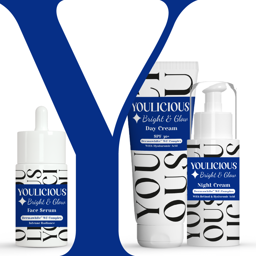 سيروم الوجه Youlicious Bright & Glow هو تركيبة متقدمة مع مركب Dermawhite™ WF لتفتيح البشرة وتوهجها الفوري - توحيد لون البشرة - ترطيب وتنعيم ملمس البشرة - تقليل الخطوط الدقيقة + كريم Youlicious Bright & Glow الليلي بتركيبة متقدمة. مركب Dermawhite™ WF لتفتيح البشرة وتوهجها الفوري - توحيد لون البشرة - ترطيب وتنعيم ملمس البشرة - تقليل التجاعيد والخطوط الدقيقة. + كريم Youlicious Bright & Glow النهاري بعامل حماية من الشمس 30 هو تركيبة متقدمة مع مركب Dermawhite™ WF لتفتيح البشرة وتوهجها الفوري - توحيد لون البشرة - ترطيب وتنعيم ملمس البشرة - تقليل التجاعيد والخطوط الدقيقة.